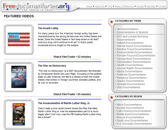 FreeDocumentaries: Disponibiliza documentários do GoogleVideo organizados por assunto e região – http://www.freedocumentaries.org/